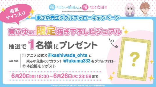 TV アニメ『顔に出ない柏田さんと顔に出る太田君』が 2025 年 10 月に放送開始することが決定しました!さらに、10 月放送開始を記念して、東ふゆ先生限定描き下ろしビジュアル(直筆サイン入り)が当たるダブルフォローキャンペーンも開始しました!キャンペーン詳細は公式 X をご確認の上、ぜひご参加ください!