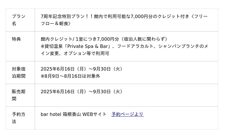 シマダグループ(東京都渋谷区、代表:島田成年)が運営するbar hotel箱根香山(神奈川県箱根町小涌谷)では2025年7月6日に創業7周年を迎えます。2025年9月30日までの期間、館内施設で利用可能な7,000円のクレジット付き特別プランを販売いたします。