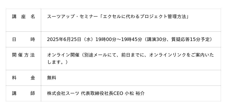 当社では、2025年6月25日(水)19時から、当社代表の小松が講師を務めるスーツアップ・セミナー「エクセルに代わるプロジェクト管理方法」を無料開催します。