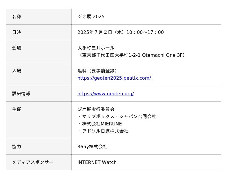 アドソル日進株式会社(本社:東京都港区、代表取締役会長 兼 CEO 上田富三、以下:アドソル日進)は、2025 年7月2日に東京 ・大手町三井ホールにて開催される地図・位置情報テクノロジーやプロダクトに関する国内最大級の展示会「ジオ展 2025」に主催企業の1社として参画するとともに、現地において当社独自のGISソリューションをご紹介するブースを出展しますので、お知らせします。