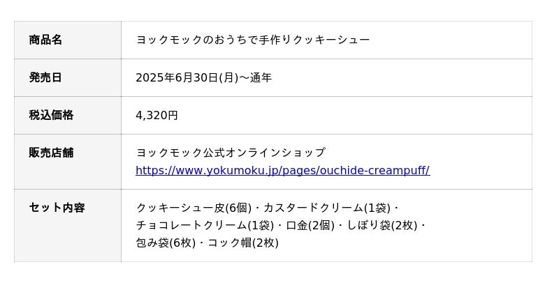 株式会社ヨックモック(代表取締役社長:藤縄武士、本社:東京都千代田区)は2025年6月30日(月)10:00よりヨックモック公式オンラインショップ限定~おうちでヨックモック シリーズ第二弾~「ヨックモックのおうちで手作りクッキーシュー」を発売します。自家製クッキーシュー皮と2種類の自家製クリームを冷凍でお届けするので、材料を一から揃える必要や計量などわずらわしい手間なく、ご家庭で手軽にお菓子づくりを楽しめます。創業以来、まごころを込めた菓子づくりを信念としてきたヨックモックがお届けする、素材からこだわり抜いた本格的な手作りキット。おうちにあるフルーツをトッピングしたり、チョコレートソースをかけるなど、自分流にアレンジしてもお楽しみいただけます。ご家族との思い出づくりや、休日に友人をお招きして過ごすティータイムのおもてなしにいかがでしょうか。