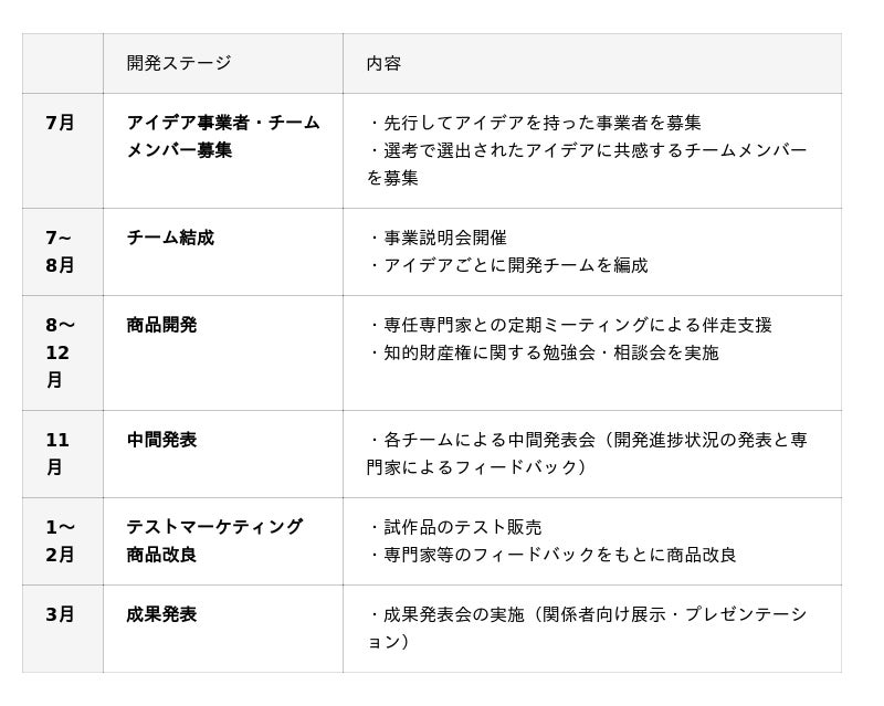 選ばれたアイデアには、専門家による伴走支援や最大30万円の開発補助費が支給され、約8か月間の開発・改良・テスト販売を経て、商品化を目指します。