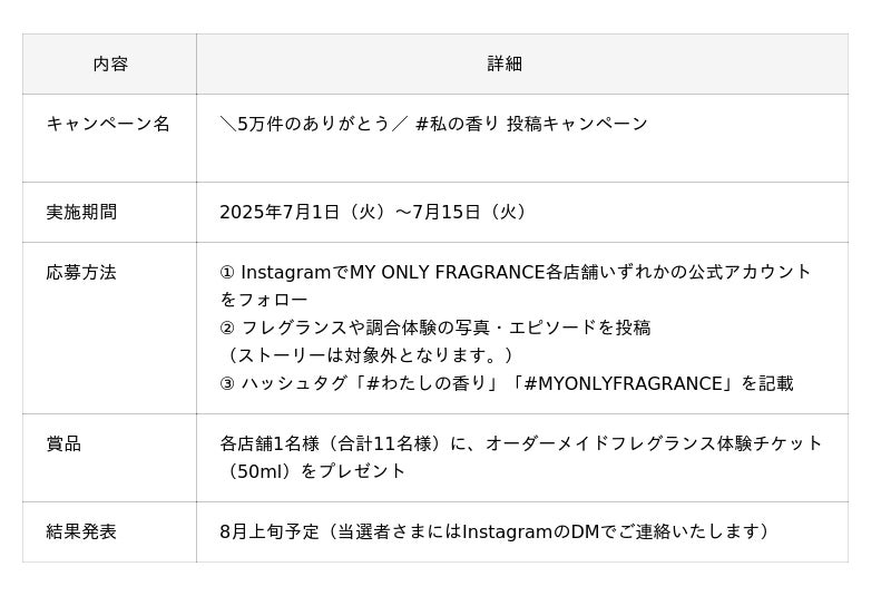 京都発のオーダーメイドフレグランス専門店「MY ONLY FRAGRANCE(マイオンリーフレグランス)」を展開する株式会社フレグランスプロジェクト(本社:京都府京都市、代表取締役:和田慎平)は、全国11店舗での調合体験を通じて寄せられたGoogleクチコミが累計5万件(2025年6月時点)を突破したことを記念し、2025年7月1日(火)より、感謝の気持ちを込めたSNS参加型キャンペーン「#私の香り 投稿キャンペーン」を開催いたします。