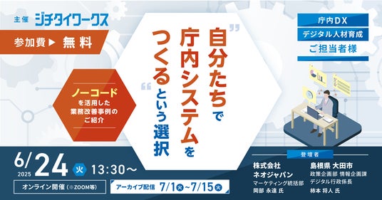 株式会社ネオジャパン(本社:神奈川県横浜市、代表取締役社長:齋藤 晶議)は、2025年6月24日(火)に開催される「自分たちで庁内システムをつくる”という選択 ~ノーコードを活用した業務改善事例のご紹介~(主催:株式会社ジチタイワークス)」に登壇いたします。