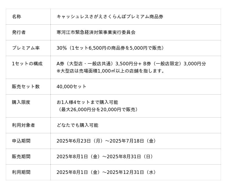本商品券は、寒河江市民だけでなく、どなたでも購入可能で、「A券(大型店・一般店共通)」と「B券(一般店限定)」の2種類をセットで販売し、特に一般店舗での利用を促進する仕組みとなっております。
