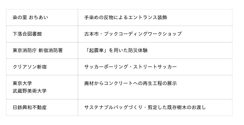 開催当日は、終わりと始まりの転換点である建物解体前において、「『街・建物・人々』がこの地で落ち合い、『過去と未来』が一つの物語となって綴られていく姿」を目指し、2日間を通して1,100名を超える方にご参加いただきました。また、開催に当たり高田馬場および下落合の地域店舗の協力のもと、多彩なコンテンツを用意し地域の魅力を感じられる仕掛けづくりを行いました。当社のブースでは当社と所縁の深い岩手県釜石市の間伐材を用いたサステナブルバッグの制作や剪定した既存樹木のプレゼントを通して、全ての世代に自然の持つ温かみを感じていただくことができました。