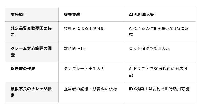 → 過去の類似配合・対策履歴を抽出し、 新製品開発や工程改善に活用可能。