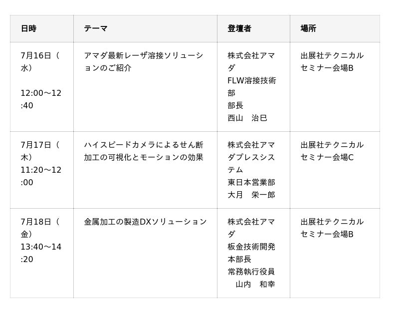 アマダグループの板金・微細溶接、プレス自動化ソリューション、ばね成形機、大型プレス事業から、4ブースを出展。お客さまが抱える様々な課題を解決する最新のマシンや加工技術をご紹介します。また、会期中のテクニカルセミナーでは、最新のファイバーレーザ溶接ソリューション、工程間の自動化と製造DXを組み合わせたソリューション、プレス加工の見える化をご紹介します。