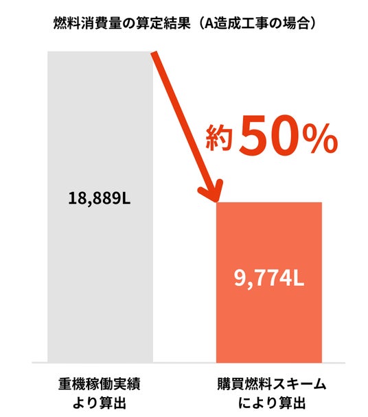 現在、元請会社が各現場における燃料由来のCO2排出量を算定する主な方法として、重機等の稼働台数や稼働時間から燃料消費量を算出し、CO2排出量を算定しています。実証実験ではこのような「重機の稼働実績から算出した場合」と、「本スキームにより算出した場合」の燃料消費量の算定結果を比較したところ、ある現場では算出されたデータに約50%の差分が生じる結果となり、本スキームはより実態に近いCO2排出量を算定できる可能性が高いことが確認されました。株式会社フジタ様からは本スキームについて、「人の手をかけずに燃料使用量の正確なデータを取れることは非常に重要だと思っている」と、評価のコメントを頂戴しました。