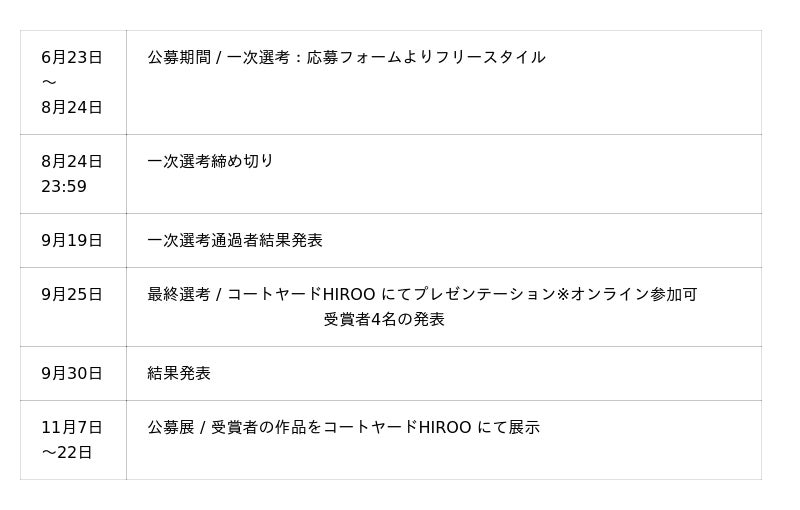 内容:副賞として、2026年 コートヤードHIROOでのアートプログラムの実施。アーティスト・イン・レジデンス、グループ展など相談の上決定いたします。