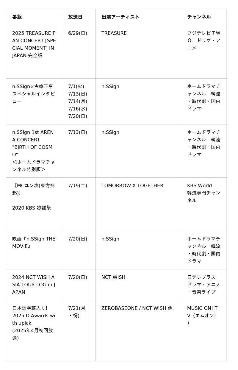 7月6日(日):aespa / ILLIT / INI / NCT WISH / NiziU / n.SSign / THE BOYZ / TOMORROW X TOGETHER