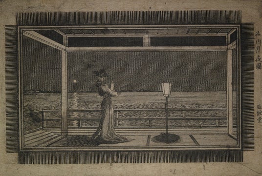 展示の第1章では、「黒」と聞いて思い浮かぶ「夜」に関連して、月夜の情景や人々の暮らしの様子といった夜を描いた作品の中でも、影や暗闇などの描写に注目し、黒がどのように用いられたのか探ります。第2章では、背景を黒く塗り込んだ作品や、黒を基調とした「墨彩色」「紅嫌い」と呼ばれる趣味人たちに好まれた浮世絵などから、それらが何を象徴するのか検討します。