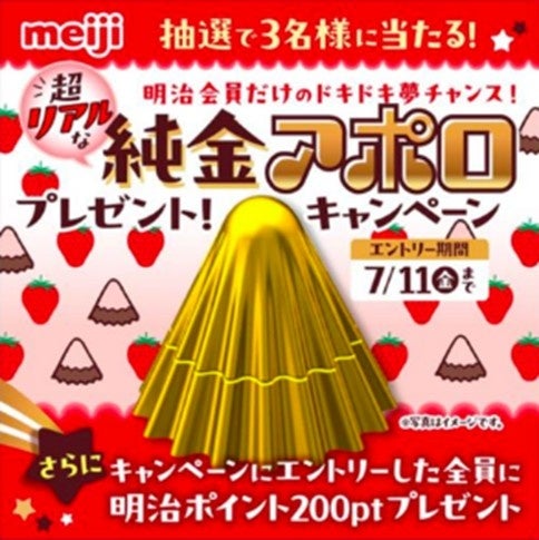 2.キャンペーンページにてエントリーいただいた方の中から抽選で3名様に「純金アポロ」をプレゼント。さらに、キャンペーンにエントリーいただいた方全員に、明治ポイントを200ptプレゼントします。