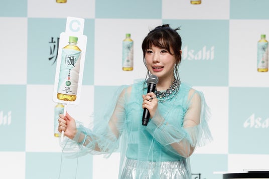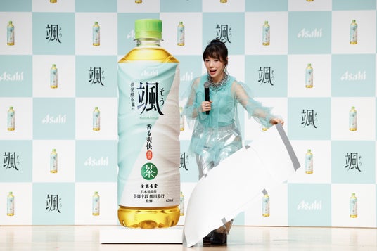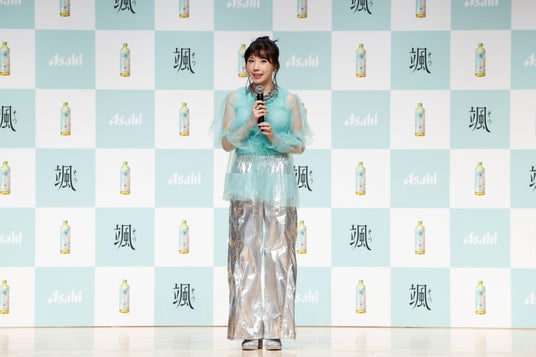 仲里依紗さん、登壇!巨大ボトルをアンベール!新時代の緑茶 『アサヒ 颯』 新CM発表会 開催