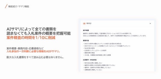入札案件に添付されている仕様書をAIが自動で要約を行います。複数のファイルを確認し、自社で対応可能な案件かの精査をする、という従来時間のかかっていた業務を大幅に効率化します。