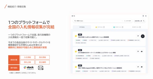 全国の官公庁、自治体の入札・落札情報をLabid上で検索いただくことが可能です。複数の自治体のサイトや入札情報のポータルサイトなど、多数のサイトを確認して入札情報を探すといった非効率な作業を効率化します。