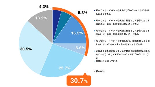 「知っており、イベントや大会に(プレイヤーとして)参加したことがある」(4.3%)、「知っており、イベントや大会に観客として参加したことはあるが、動画・配信番組は見たことがない」(5.3%)、「知っており、イベントや大会に観客として参加したことはないが、動画、配信番組を見たことがある」(15.5%)、「知っており、イベントに参加したり、動画を見ることはしないが、eスポーツタイトルをプレイしている」(5.6%)を合計すると30.7%となり、約3人に1人の大学生・大学院生が何らかの形でeスポーツに接触していることが明らかになりました。