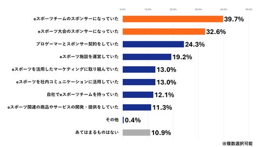 その結果、「eスポーツチームのスポンサーになっていた」が39.7%でトップとなり、「eスポーツ大会のスポンサーになっていた」の32.6%が続いています。3割以上の就活生が、企業のスポンサー活動を通じて、その企業への関心を高めていることが明らかになりました。