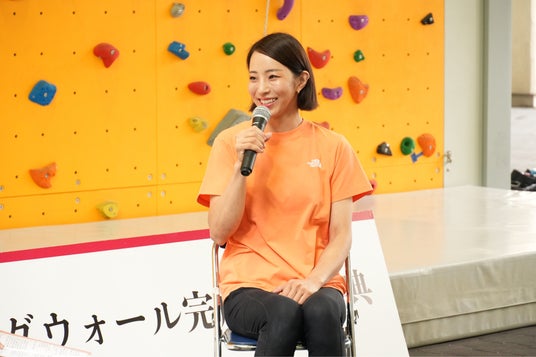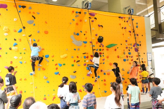 イベントでは、東京五輪銅メダリストでプロクライマーの野口 啓代(のぐち あきよ)さんをお招きし、トークショーとデモンストレーションを披露いただいたほか、事前に応募いただいた区内の小中学生たちが、実際にボルダリングを体験しました。