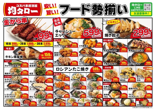 51品のバラエティー豊かなフードメニューは99円(税込109円)から599円(税込689円)とどれを選んでも激安コスパ系を実感していただけるはず。今後とも激安コスパ系居酒屋・均タロー/大衆酒場きんたろうは「安い!旨い!」の居酒屋体験を全店でお届けいたします。