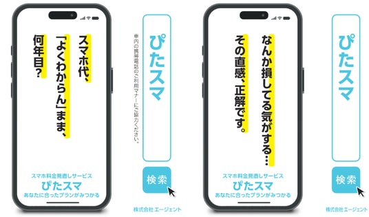 株式会社エージェント(本社:東京都渋谷区、代表取締役:四宮浩二)は、スマホ料金の見直しをサポートする無料オンライン相談サービス「ぴたスマ」の認知向上を目的として、2025年6月10日より都営新宿線車内のつり革広告を初掲出いたしました。