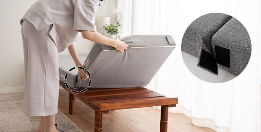 付属のジョイントテープで簡単に着脱できる構造のため、単体でもフロアクッションとして活用できます。重ねてスツールのように使ったり、お子様のプレイマットにしたりと、アイデア次第で使い方は自由自在です。