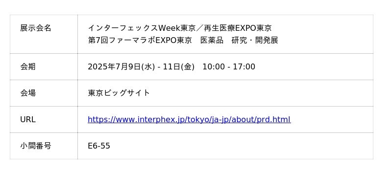 また、エンビジョンは、2025年7月9日(水)~11日(金)の期間東京ビッグサイトで開催されるインターフェックスWeek東京/再生医療EXPO東京内の第7回ファーマラボEXPO東京 医薬品 研究・開発展にて初展示を予定しております。ぜひご来場ください。