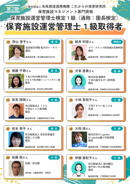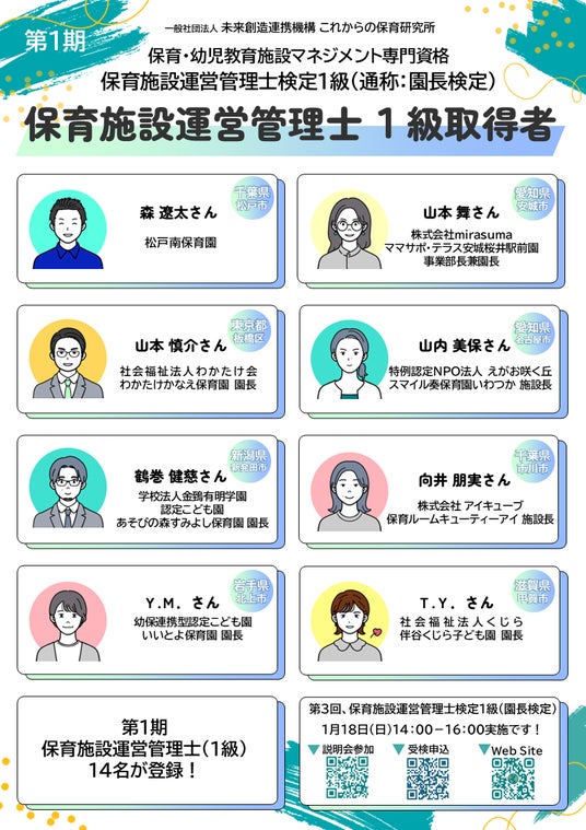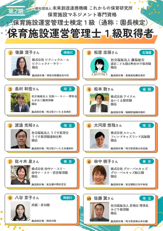 一般社団法人 未来創造連携機構 これからの保育研究所(本部:神奈川県川崎市高津区、代表理事:斉藤 和琴)は、保育施設運営管理士検定1級(通称:園長検定)の実施を経て、合格者48名のうち、新たに39名の保育施設運営管理士(1級)を認定しました。累計で本資格の保有者が53名となりました。