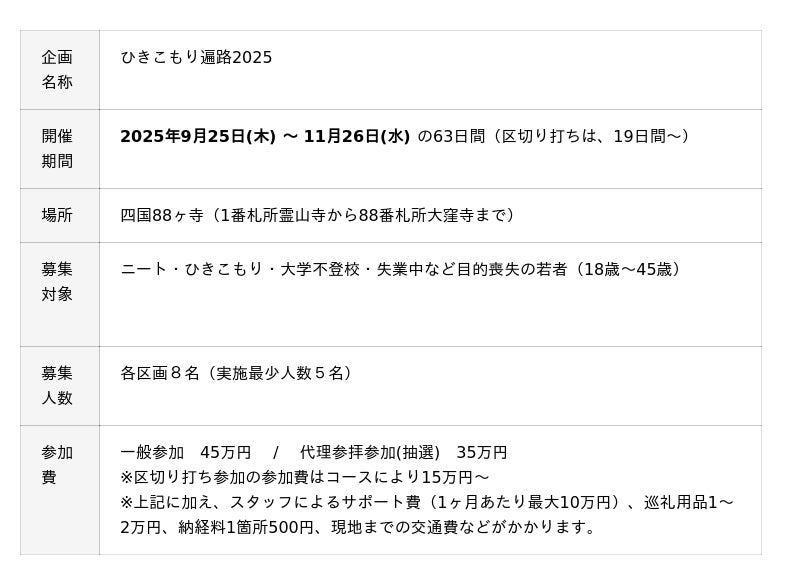 ひきこもり支援の専門団体である認定NPO法人ニュースタート事務局(本部:千葉県浦安市、理事:二神 能基)が実施する、「ひきこもり遍路2025」。ひきこもりやニート当事者など、目的喪失の若者が、四国の豊かな自然と文化の中で、人々とのふれあいや自分自身との対話を通じて世界を広げ、「自分なりの生き方」を発見することを目的としています。