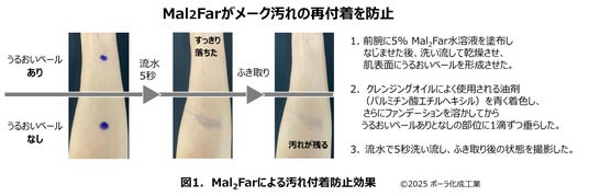 実際に、Mal2Farがクレンジングオイルの付着を防ぐことが確認されました(補足資料3)。本技術により、クレンジングオイルの弱点であった洗い流し時の残留感を解消することに成功。さらにはMal2Farによるうるおい保持機能も併せ持つ高機能なクレンジングオイル製剤が実現しました。