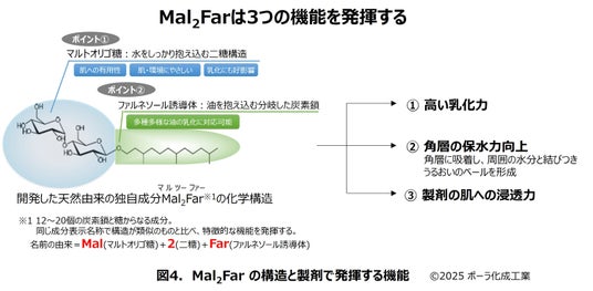 ポーラ化成工業の独自成分であるMal2Farは天然由来であり、ひとつの成分だけで「高い乳化力」「角層の保水力向上」「製剤の肌への浸透力」の3つの機能を有することが分かっています(図4)。