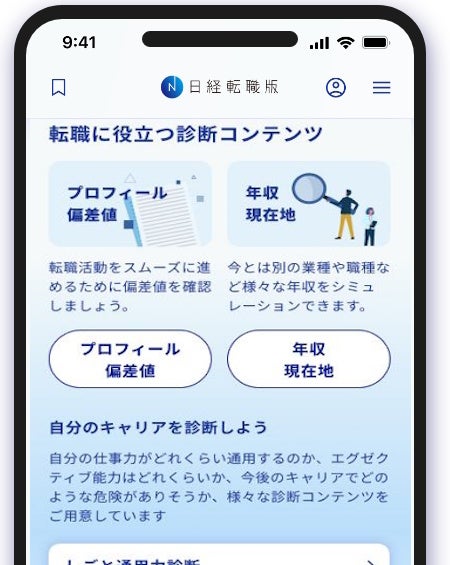 ・「年収現在地」「仕事通用力診断」「キャリアハザード診断」「エグゼクティブ力診断」など、自己把握とキャリア形成の戦略立案をサポートするツールを提供しています。