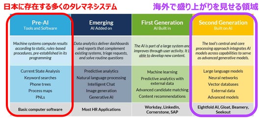 既存のタレマネやERPでは、こういった変化に対応する十分な機能やソリューションを企業に提供できていないこともわかってきました。世界で最も著名なHRTech研究家Josh Bersin氏によるHRTechプロダクトの4つのステージ図でも、ほとんどの日本のHRTechプロダクトは最も前時代的で、AIを含まないカテゴリーに分類されます。