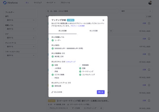自身の職務経歴や評価データから抽出されたスキルと社内求人において抽出されたスキルをベースとして、自分に向いているどの様なチャンスがあり、どれくらい現在のスキルを生かせるのか、をリアルタイムにマッチングで把握することが可能であり、社内公募(ポスティング制度)でも活用可能です。