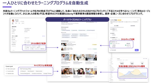 社員のスキルや将来のキャリアプランをベースとして、社内においてマッチポジションをマッチング、また不足するスキルを多数のラーニングコンテンツから自動でリコメンド。キャリアプランに沿って、難易度とスキルをベースにカリキュラムを自動でAIが生成することも可能。