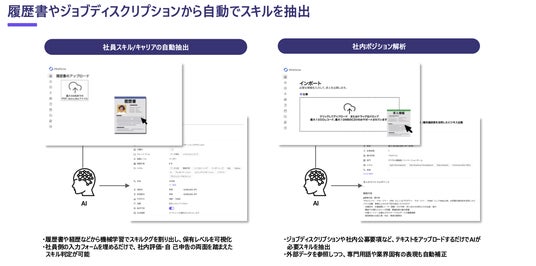 日本向けにカスタマイズされた70,000件のスキルタクソノミーをベースとして、平文で書かれた会社内のポジション情報、求人情報、社員情報、リスキリングコンテンツ全てを非常に高い精度でスキルに落とし込みます。つまりそのポジションや求人で必要となるスキルを自動で抽出を行い、また社員が持つ保有スキル、各リスキリングコンテンツで学ぶことができるスキルを抽出致します。