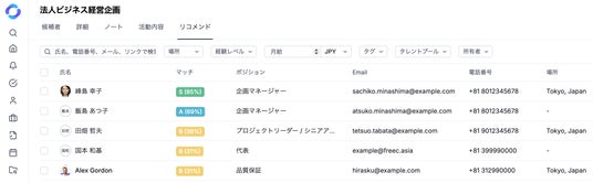 またポジションや社内求人をベースとしてどの人材が最適なのかを様々な項目によってマッチング度を算出し、リアルタイムにリコメンドを行います。