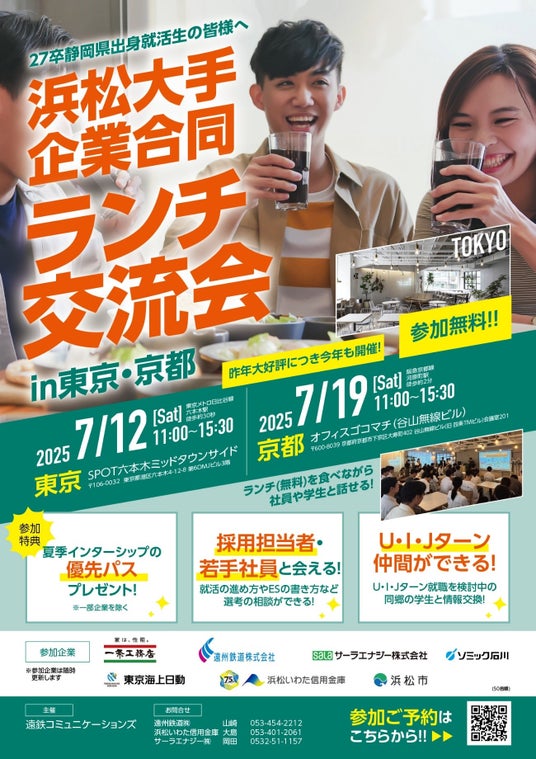 遠州鉄道株式会社(本社:静岡県浜松市中央区旭町、社長:丸山晃司)および浜松いわた信用金庫(本店:静岡県浜松市中央区元城町、理事長: 高柳裕久)は、首都圏および関西圏の大学に通う浜松ゆかりの学生を対象に、浜松市に拠点を置く企業と地元自治体の計7団体による「合同ランチ交流会」を東京・京都で開催します。