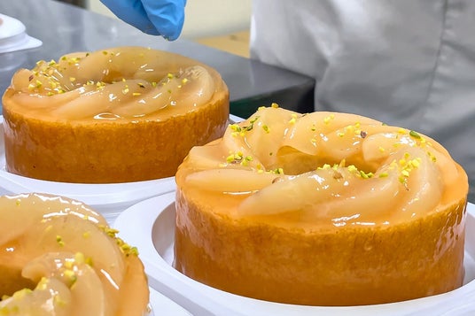 そうしてようやくたどり着いたのが、甘み・香り・そして色までもが桃そのもののような、奇跡のピューレソース。ピューレソースをたっぷり染み込ませたバウムを見て、思わず「わあ」と声がもれるような、ときめきの“桃ピンク”が、そこに咲きました。