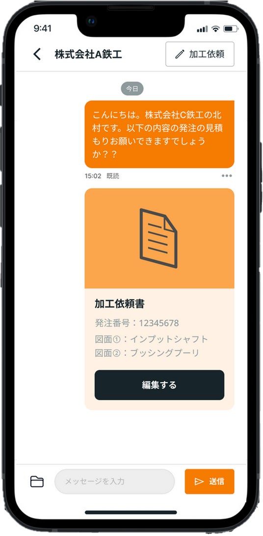 Millyのチャット画面。図面の送付から見積依頼・確認まで、すべてがリアルタイムで完結します。