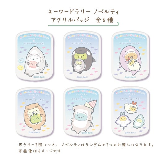 さまざまなサメになりきったすみっコぐらしたちと一緒に、サメ飼育種類数日本一の水族館をめぐってキーワードを集めましょう。ゴールでは、「限定アクリルバッジ」(全6種)の中から、ランダムで1個をプレゼントいたします。