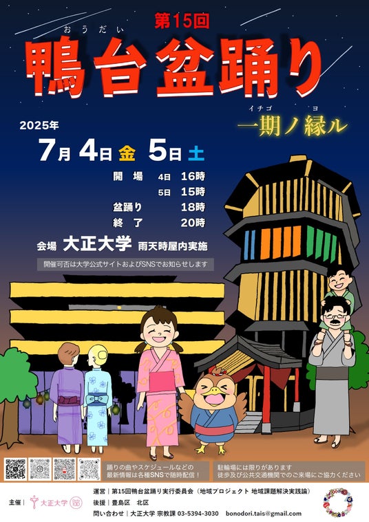 大正大学(学長:神達知純、所在地:東京都豊島区)は、2025年7月4日(金)と5日(土)に「第15回鴨台盆踊り」を開催します。