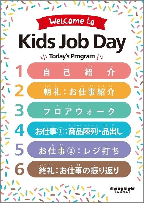 - 『Kids Job Day』は、フライングタイガーがお届けする、親子で参加できる職業体験プログラム。「WORK(働く)」という社会の仕組みを、実際の店舗での就業を通して、親子で学んでいただきます。当日は、レジ打ち・品出しなどの実業務を体験できます。