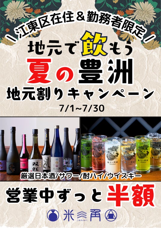 日本一の中央卸売市場の食のテーマパークである【豊洲 千客万来】内にあるSAKEペアリング酒場「米三角」(所在地:東京都江東区、運営:株式会社浜友E.F. 代表取締役:大石恵司)は、地元・江東区在住および区内勤務の皆様を対象に、対象ドリンクが50%オフとなる「夏の地元割り!キャンペーン ~豊洲ハッピーアワー!~」を、2025年7月1日(火)~7月30日(水)の期間限定で開催いたします。