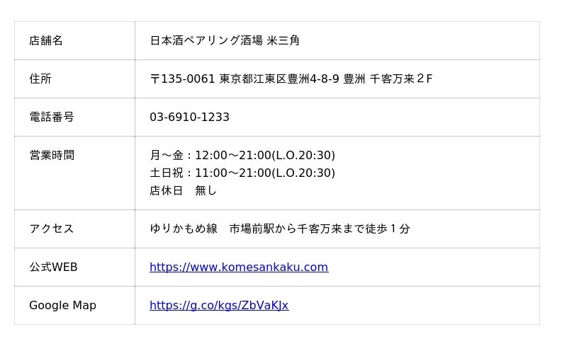 SAKEペアリング酒場「米三角」豊洲 千客万来2F