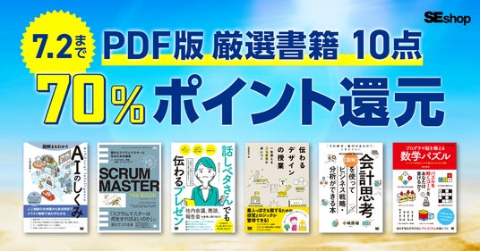 株式会社翔泳社(本社:東京都新宿区⾈町5、社長:臼井かおる)の運営する公式通販サイトSEshopは、2025年6月27日(金)から7月2日(水) まで、厳選したPDF版書籍10点が70%ポイント還元、そのほか対象のPDF版書籍1700点以上が40%ポイント還元となる「SEshop厳選10冊70%ポイント還元キャンペーン」を開催します。
