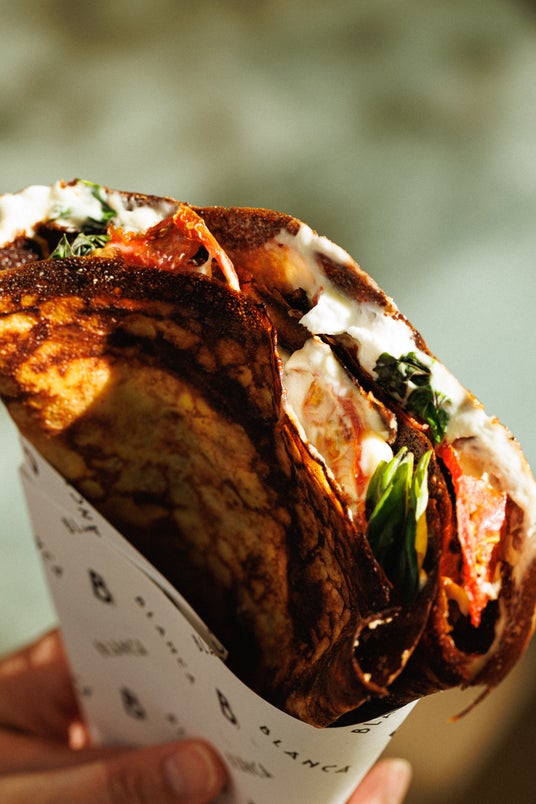 「バジルトマト&チーズクレープ」は、フレッシュバジル、自家製ドライトマト、BLANCA特製クリームチーズを贅沢に組み合わせた一品。ナチュラルな甘みとコクが広がる、軽食にもぴったりな逸品です。
