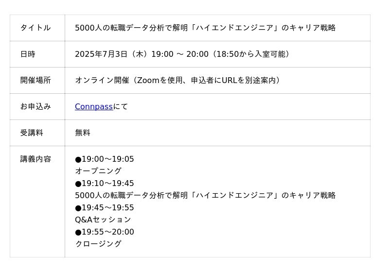 7月3日|キャリア講義『5000人の転職データ分析で解明「ハイエンドエンジニア」のキャリア戦略』をオンラインにて開催
