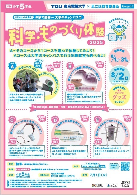 東京電機大学(学長 射場本忠彦)は、足立区教育委員会との連携企画として、8 月1 日(金)~31 日(日)の1 カ月間のオンデマンド配信及び、8 月2 日(土)対面にて、足立区内の小学5 年生を対象に動画を見ながら実験や工作にチャレンジできる「科学・ものづくり体験教室」を開催します。