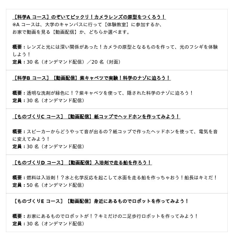 参加者には専用の作成キットが自宅に届けられ、実験や工作のやり方は動画の中で、本学の教員や大学院生が分かりやすく解説します。配信期間中は、いつでも、何度でも動画を視聴でき、夏休みの自由研究にもピッタリの講座です。対面の体験教室では、大学のキャンパスで本学教員の説明を受けながら本学学生と一緒に科学のふしぎを体験します。